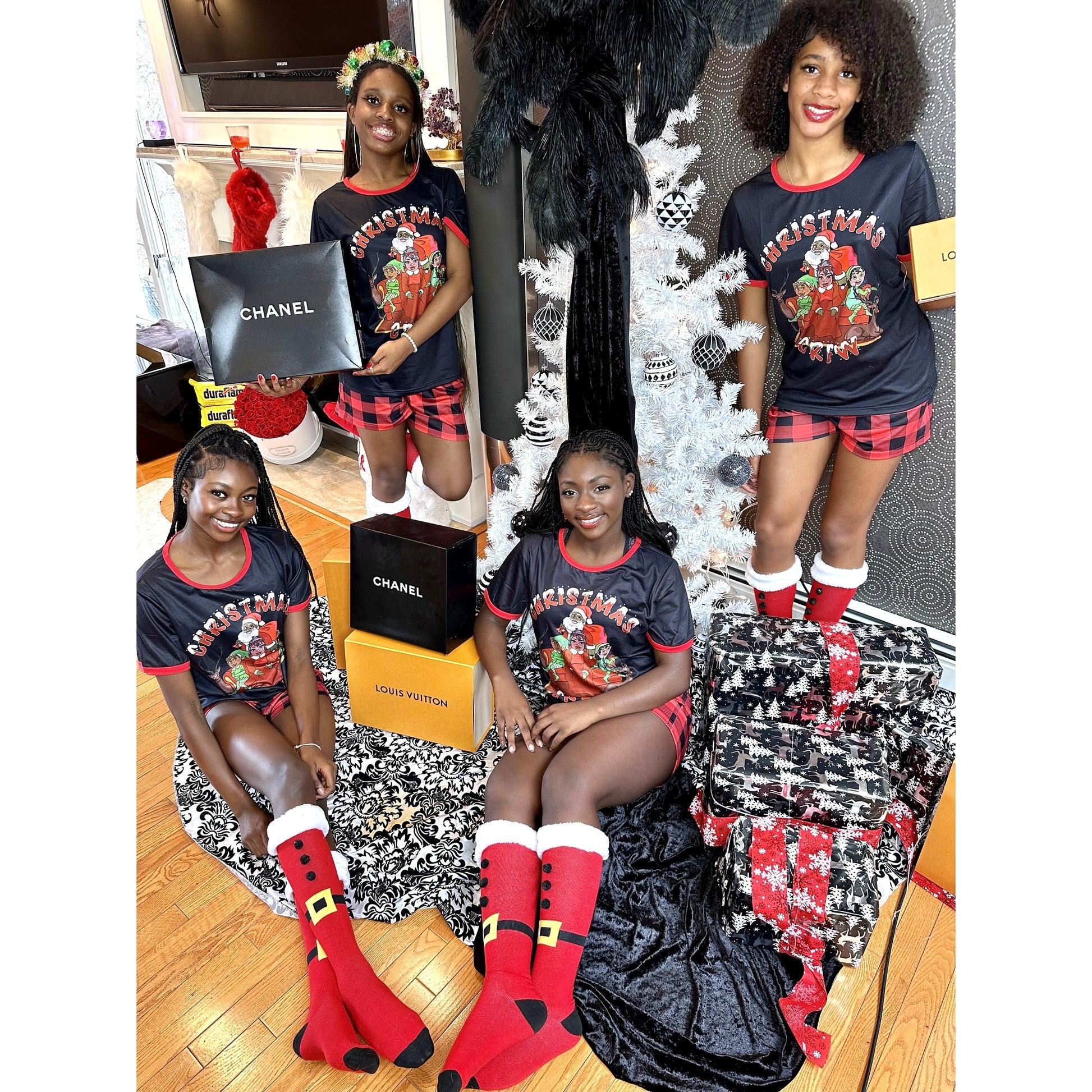 Christmas Crew Short Set Black Top and Red and Black Shorts - Women's